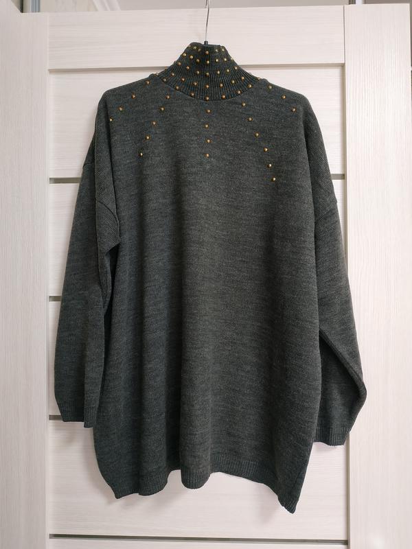 Теплий светр оверсайз, розмір підійде від XS до XXL. Можна одягати як коротке плаття під щільні колготки або лосини. Заклепки дуже міцно триматися, не злітають. Мої параметри зростання 168 ОГ 89, ВІД 64, ПРО 90