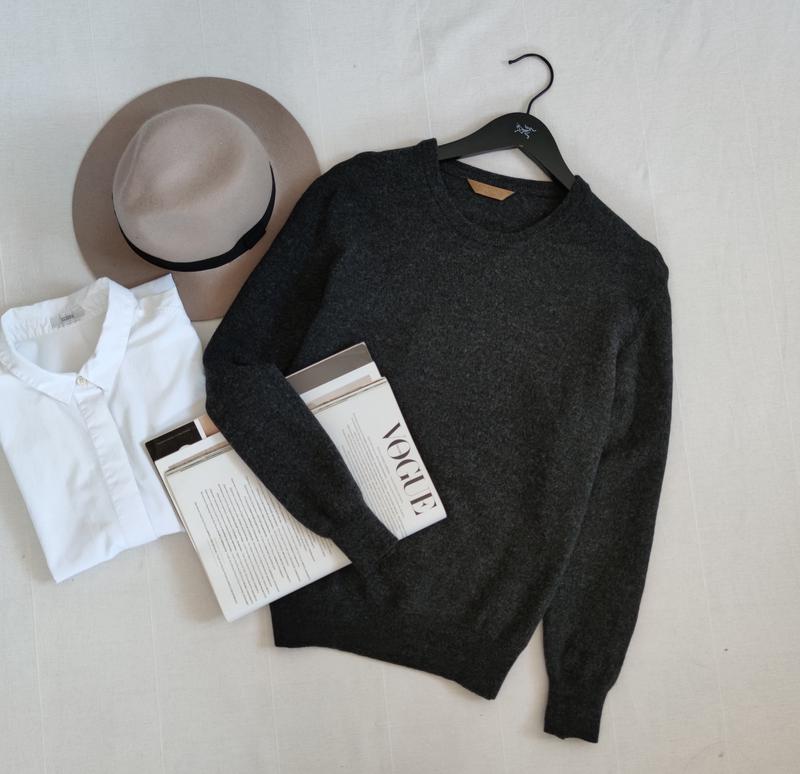 Сірий светр від Dalmine вільного крою, тканина 70% шерсть, 30% кашемір, розмір вказано М, ПО грудей 53 см, довжина 62 см, довжина рукава від горловини 70 см