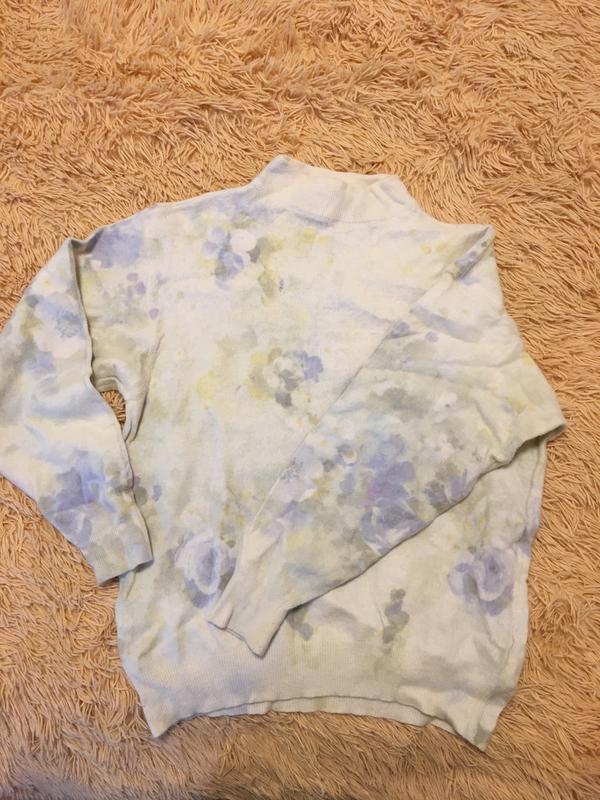 Ангоровый светр, красива забарвлення, ніжні квіти. Горло стоичка, що дуже актуально. Трошки кусається, шерсть у складі. Фасон оверсайз