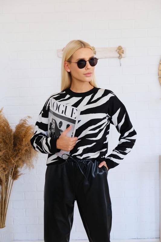 Светр ▫️ Матеріал: машинна в'язка ▫️ Колір: молочний-чорний принт зебра ▫️ Розміри: uno ▫️ Довжина виробу: 55 см ▫️ Довжина рукава від горловини: 69 см ▫️ Параметри моделі: 88-67-88 ▫️ Зростання моделі: 172 см ▫️ На моделі розмір: uno 90% акрил, 10% індустріальний мохер