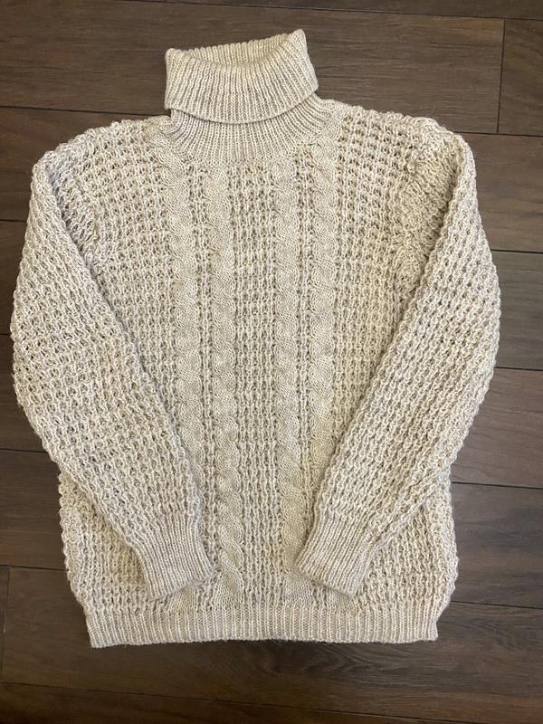 Идеальное состояние, бежевый тёплый свитер с еле заметной мерцающей нитью, тянется шикарно свободного кроя! Длина 56-58 см Плечи 38-42 тянется Рукав 49 Грудь ПО 43 см Низ ПО 41 см