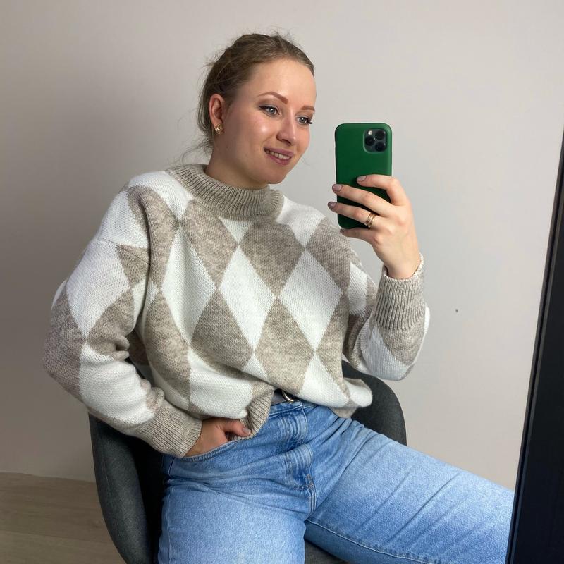 Теплий, дуже приємний до тіла светр з актуальних візерунком в ромб. Склад: 50% вовна, 50% акрил. Приміряти можна в р. Дніпро. Своє виробництво.