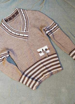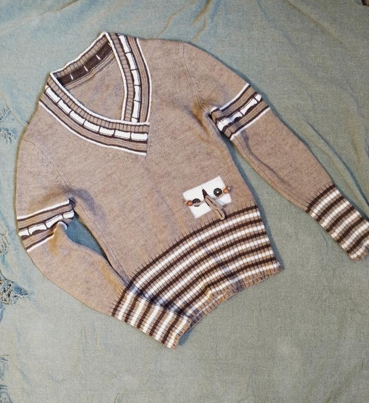 Светр коричневий з смужками на рукавах і низу виробу. Тягнеться відмінно. Довжина - 59 см Ширина -37 см Довжина рукава - 58 см
