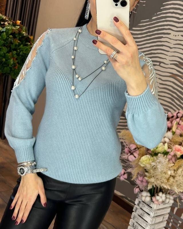 🧡НОВИНКА СЕЗОНА 🍃🍃🍃 очаровательный свитер свободного кроя с круглым вырезом на резинке внизу и рукавах изготовлен из качественного и приятного к телу трикотажа гладкой машинной вязки декорированного элегантной аппликацией из нежной сетки и пришитых страз свитер отлично подойдёт для работы, учебы и досуга, он согреет вас , создаст хорошее настроение и займёт достойное место в вашем гардеробе РАЗМЕР УНИВЕРСАЛЬНЫЙ 42-46 ДЛИНА ИЗДЕЛИЯ 62-64 СМ КОД 658 🍃