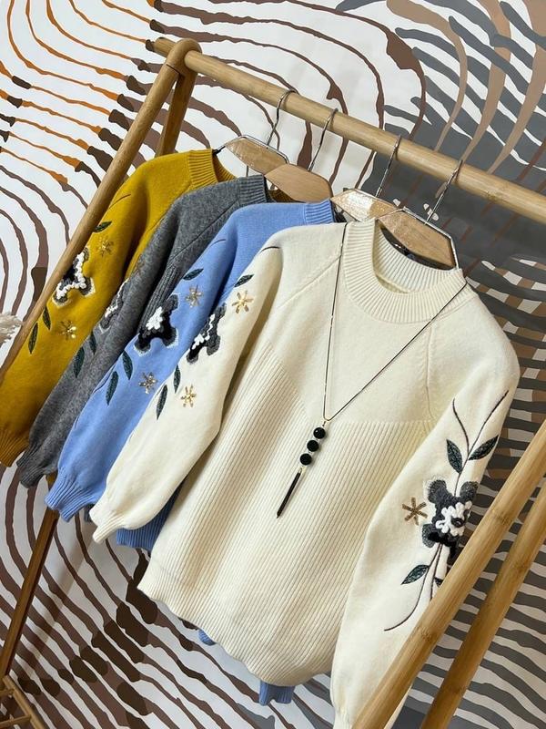 🧡НОВИНКА СЕЗОНА 🍃🍃🍃 очаровательный свитер свободного кроя с круглым вырезом на резинке внизу и рукавах изготовлен из качественного и приятного к телу трикотажа гладкой машинной вязки декорированного очаровательной аппликацией из ярких цветов свитер отлично подойдёт для работы, учебы и досуга, он согреет вас и займёт достойное место в вашем гардеробе РАЗМЕР УНИВЕРСАЛЬНЫЙ 42-46 ДЛИНА ИЗДЕЛИЯ 62-64 СМ КОД 1519 🍃