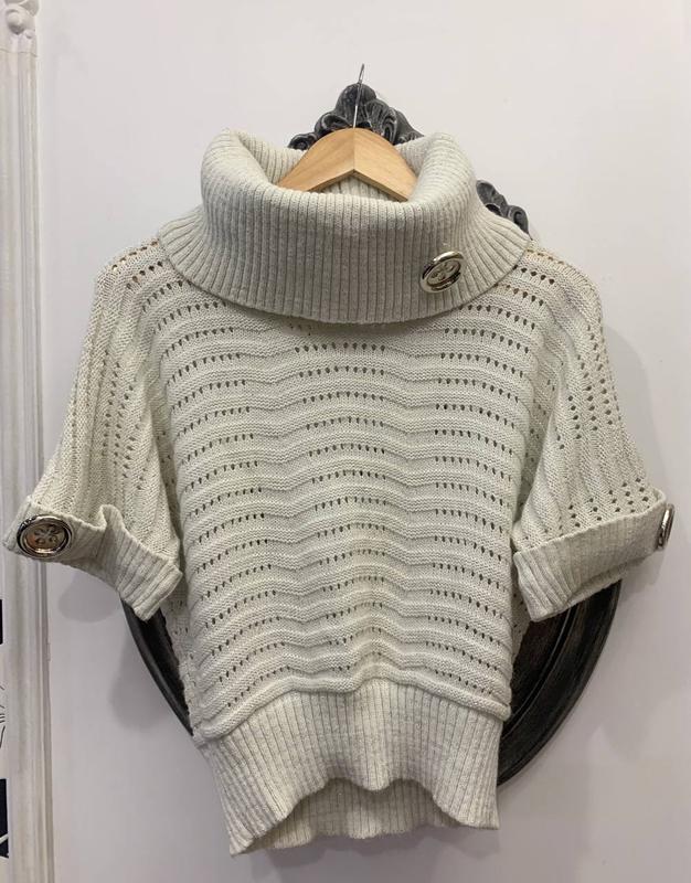 Эффектный женский вязаный свитер,производитель Турция,с высокой горловиной,с большимы пугавицами,белого цвета с серебристой ниткой,состав: 70 % акрил,20 %шерсть,10% елит.Размер универсальный,новый,но без бирки.