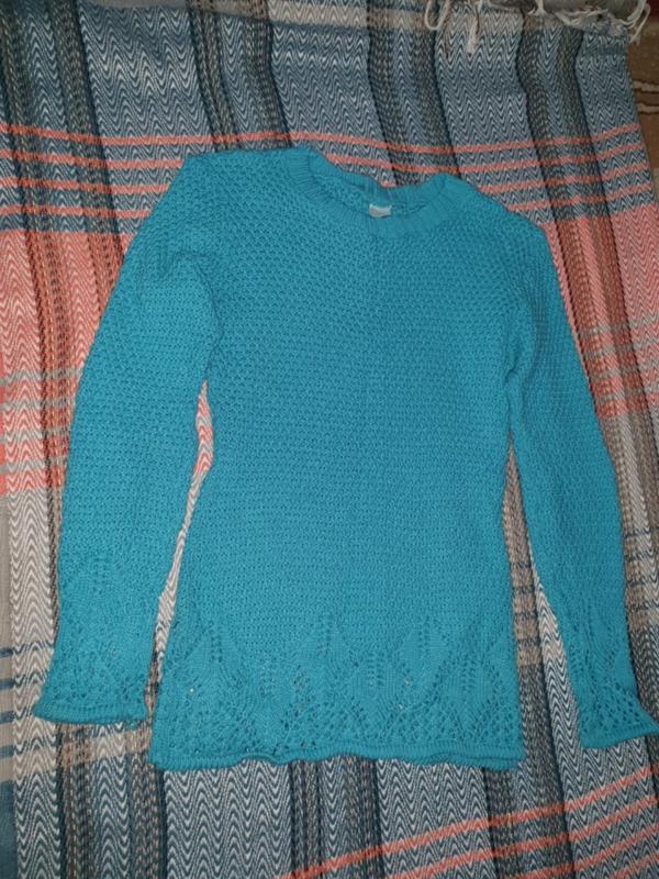 Блакитного кольору, в'язання пов'язана. Розмір М.