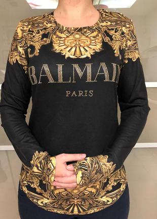 Кофта Balmain черного цвета с золотыми узорами, украшена золотыми пуговицами и стразами. Кофточка очень шикарно и ярко смотрится!! Отличный материал, не парит, мягкий и приятный к телу. Размер XL, подойдет на L, по длинне 65 см., по плечам 40-43 см., обьем груди 94-106 см., длинна рукава 64 см. Кофточка новая, с этикеткой.