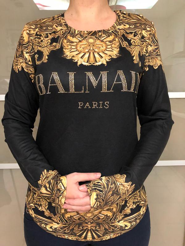 Кофта Balmain чорного кольору з золотими візерунками, прикрашена золотими гудзиками і стразами. Кофточка дуже шикарно і яскраво виглядає!! Відмінний матеріал, не парить, м'який і приємний до тіла. Розмір XL, підійде на L, за довжиною 65 см., по плечах 40-43 див., обєм грудей 94-106 див., довжина рукава 64 див. нова Кофтинка, з етикеткою.