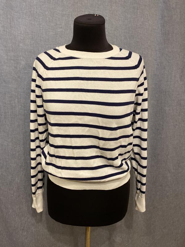 Легкий бавовняний светр, після прання тримає форму,потрібно освіжити. Чисто білий в синю смужку. Заміри: довжина від горловини 52; ширина 49; рукав від горловини 67. 💡💡💡На автоматично сформований замовлення не відповідаю, уточнюйте наявність, річ може бути в резерві або вже на оплату. З безпечної оплатою не працюю. Всім миру і добра. 💡💡💡