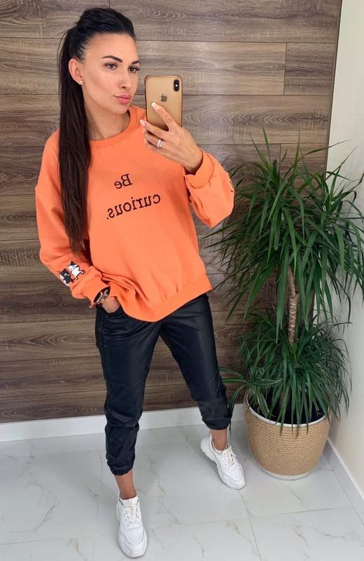 Светр, матеріал трикотаж. Ззаду трохи довше, ніж спереду. Колір оранж. Попереду вишивка напис. Розмір оверсайз.