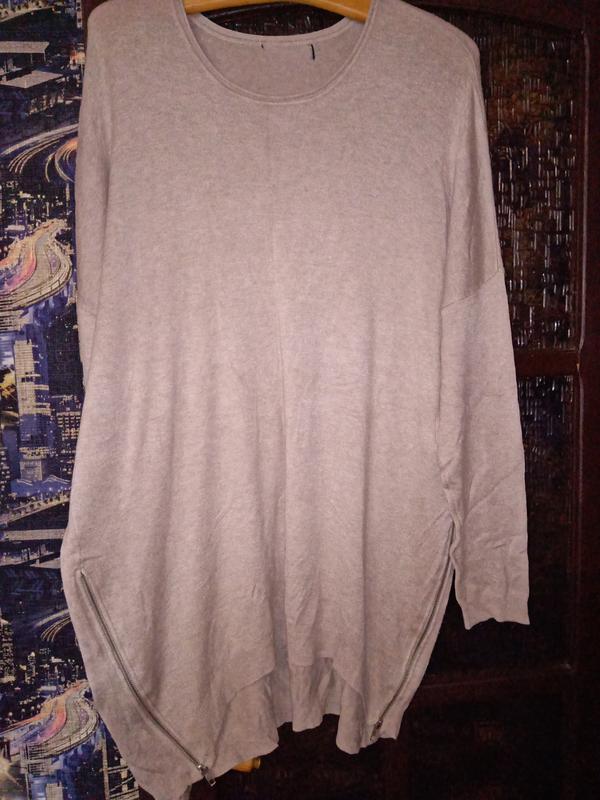 пог 72см, внизу 73см, довжина 83см спереду і 95см ззаду, рукав спущеный. Тонкий светрик з замочками по боках, добре тягнеться.
