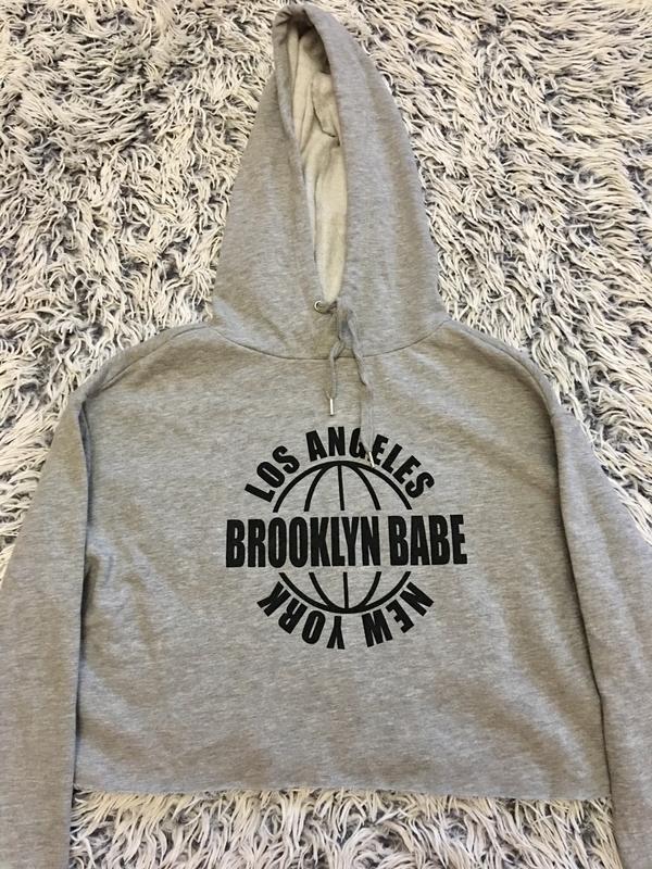 Сіра кофта-світшот укорочена, з капюшоном , всередині легенька баєчка. Розмір-s вільного крою. В ідеальному стані
