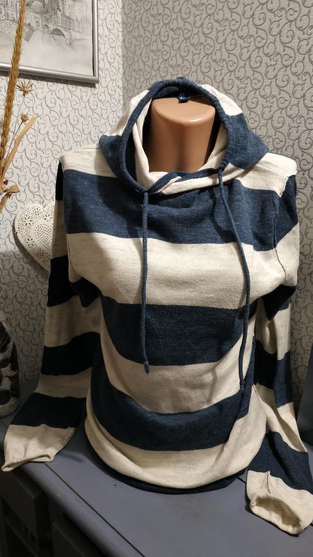Легкій светр з капюшоном. Тканина катон. Бокові шви, та на рукавах, назовні. На фото здається що є ковтунці, але їх насправді нема. . Дужа гарно виглядає з джинсами. Розмір S. Довжина 70см. Ширина ПОГ 48см