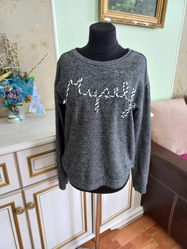 світшот із трикотажу, середньої щільності, трьох нитка колір темно сірий меланж, довжина 55/62 , довжина рукава 55 плече спущено 15 ,об'єм 1/2 52