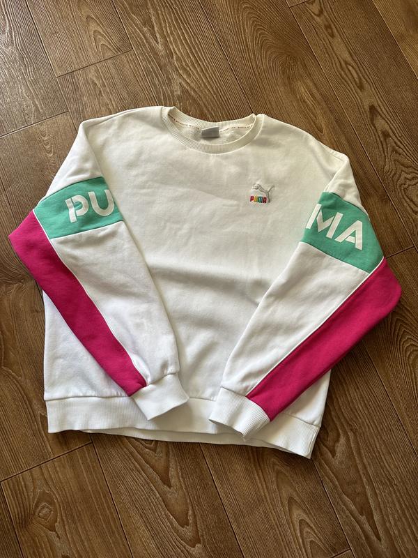 Крутой яркий свитшот от puma, состояние идеальное. Был в носке не долго, дефектов нет, размер м, но пойдет и на другие размеры, я размера s, на мне сидит свободно.