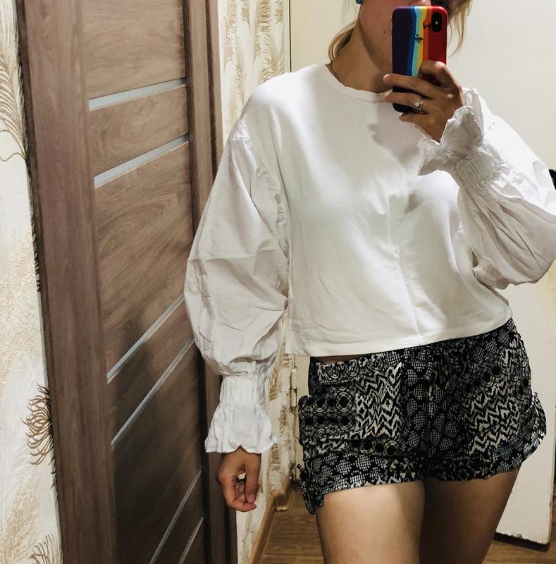 Крута блуза, рукавчики бавовна, топова частина дуже приємна на дотик, круто виглядає під низ з завищеною талією, єдиний нюанс - на останньому фото - та крапочка - це мінідирочка, є кілька мікрозатяжок, які взагалі не помітні, в ціну врахувала, через фасон підійде від хс до невеликої л