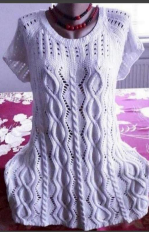Напрочуд красива річ: ажур плотний, оригінальний. гарно тягнеться. бірочки із складом тканини немає. однозначно, якщо не чистий хлопок, то в складі більша доля коттону. пог- 51-60...длина 72-73....рукав от горла 25 поб 57- 64...низ 65см