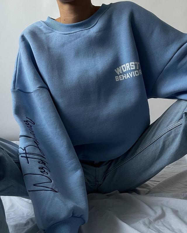 Стильний, якісний світшот Дівчата, він просто пушка🤤 Модель 221-4943 Розмір: 42-46 ( універсал ) Кольори: молочний, блакитний Тканина: дорога Турецька трьохнитка «піньє» на флісі ( м'яка, тепла, не кашлатиться ), манжет на рукавах та горловині - кашкорсе Рукав - вишивка Спереду та на спинці - якісна накатка 📸Фото реал