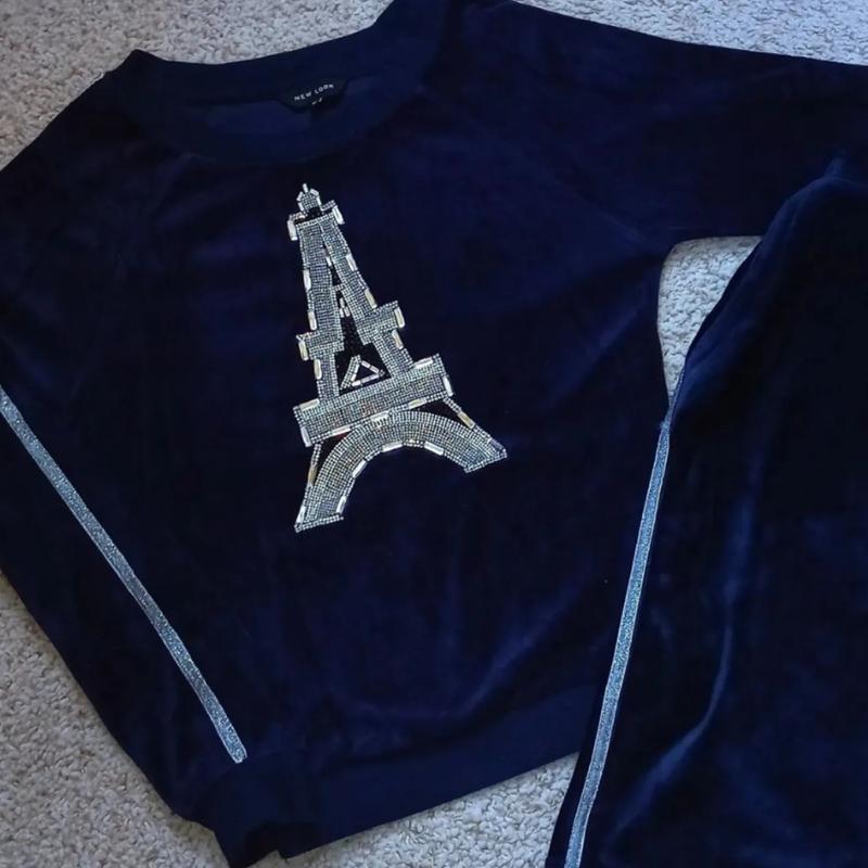 Велюровый свитшот со стразовой эйфеловой башней, сияет невероятно,фото не передает,темно синего цвета размер S-M.
