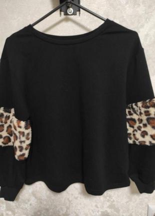 розмір хс, підзодить також на с і м, рукава об'ємні зі вставками із штучного хутра леопардовий принт, модель вільного крою. Довжина 58 см Полуобхват грудей 54 см Плечі 44 см Рукав від плеча 51 см Рукавчики широкі. полуобхват, де хутрова вставка - 20 см