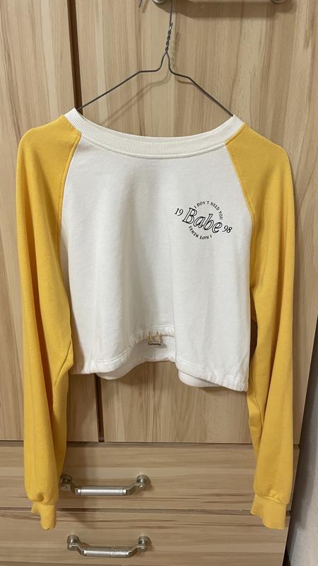 Juniors W Medium Bershka Біло-жовтий укорочений світшот. на затяжках Шукаєте модну і зручну толстовку? Топ з круглим вирізом та довгими рукавами реглан, укорочений крій ідеально підходить для повсякденних заходів та подорожей. з графічним написом та акцентами на лаштунці