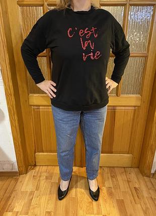 Пропоную котоновий світшот чорного кольору. На грудях напис червоним « се ля ві» ( таке життя). Мені віддала донька, каже- носи. А мені здається це для молоді .склад 100% котон. Розмір 16-18. Я на фото 18 розмір.