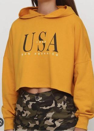 Свитшот из легкого футера с принтом. Свитшот укороченный и довольно свободный. Длинный рукав и широкая трикотажная резинка по низу рукавов.Гарное качество.Удобный, легкий и стильный. Цвет-оранжевый Страна производитель товара-Швеция Состав-100% хлопок Страна регистрации бренда-Швеция Новый, без этикетки,сток.Цвет более насыщенный, нож на фото. В наличии размеры S и М.Замеры дамас.