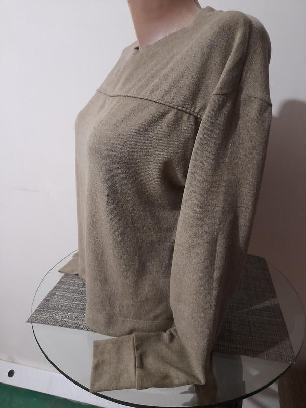 Свитшот цвет светлый хаки, мягкий, ткань напоминает велюр, тянется. Качество и состояние отличное. Пог 50, плечо спущено от горловины 77, низ 46, длина 52.