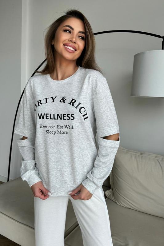 14488_светло-серый Молодіжний світло-сірий світшот, оснащений довгими рукавами з розрізами. Модель на манжетах із прямим вільним кроєм та написами. Світшот виконаний із двонитного трикотажу.