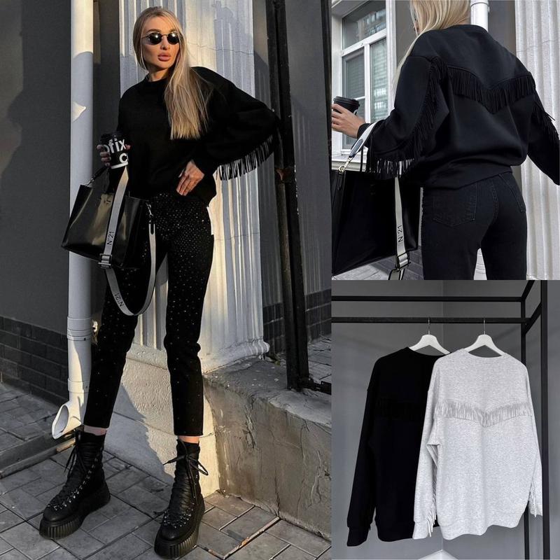 🔥🔥🔥Топ продаж🔥🔥🔥 Світшот з трендовою бахрамою COLORS: сірий меланж, чорний нова Ціна - 460грн Розмір: 42-46 (one size) ➡️Мод. 1023 ➡️Тканина: двохнитка люкс ➡️Довжина розмір 63см 👍Реально дуже круті👍 💯💯💯Рекомендую💯💯💯 ‼️Найкращі ціни, новинки. код30-1905(ТБеФ)