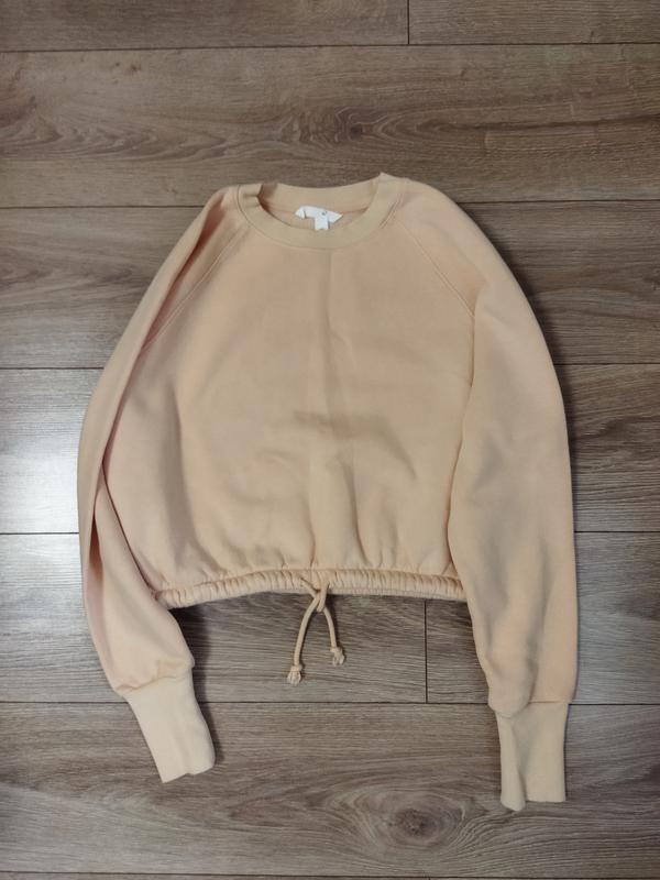 Вкорочений світшот H&M ніжного персикового кольору. Низ затягується. На флісі. Стан ідеальний. ПОГ 68 см ПО низу 42 см довжина рукава від горловини 83 см довжина по спині 45 см