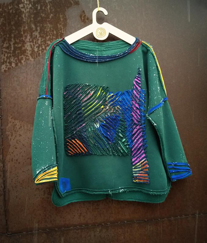 Фактурно-космічна смарагдово-тактильна рукОтворна магія за індивідуальним запитом💜✨ ✨М'який бавовняний футер на утеплювачі ✨Різновиди трикотажу в яскравих тактильно-графічних акцентах ✨Калейдоскоп різноманітних тканин для створення фактурно-космічних ландшафтів ✨Затишок і любов в кожному рукОтворному сантиметрі💛 Може бути виконаний у Вашому розмірі за Вашим індивідуальним запитом Термін виконання до 14 днів з моменту внесення передплати і надання всіх необхідних даних (мірки, кольорові вподобання, тощо)