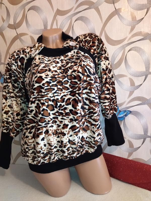 Актуальный свитшот в леопардовый принт, подойдёт на 46 размер.Спереди идёт принт,сзади однотонная спинка.Ткань тянется.Без нюансов. Замеры предоставлю по требованию