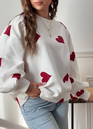 🥀Новинка🥀 ФОТО Реал⚠️ Світшот з сердечками❤️ Код 190-1530 Тканина: трьохнить на флісі Кольори: сірий меланж, білий Розміри: 42-46 Універсал Обʼємна тепла кофтина, ідеальна по сезону. Якісна накатка. Приємна мʼяка до тіла тканина.
