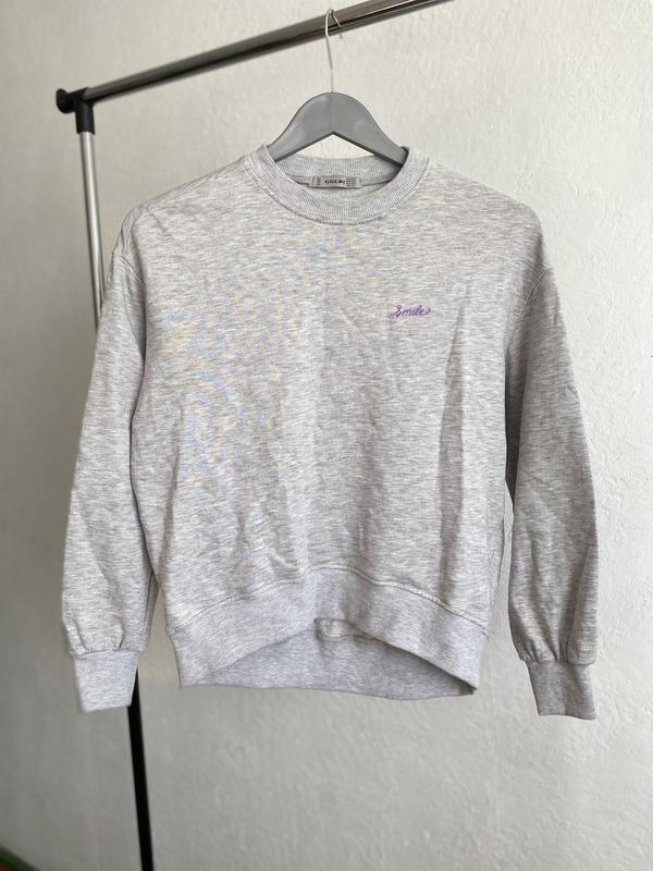 Світшот Goldi світло сірого кольору з мінімалістичним надписом. Рукава та низ світшоту на манжетах. Спереду трохи вкорочений. По бірці розмір XXS, підійде також на XS або невелику S Стан ідеальний