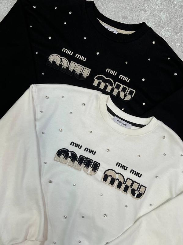 👆Світшот MİU MİU Кольори : чорний, білий Білий S Чорний М Надпис вишивка Стрази закльопки ————————- 🌹Заміри : 💎S - Довжина 58см, груди напівобʼєм 56см, довжина рукава від плечового шва 50см, довжина рукава від горловини 70см 💎M - Довжина 60см, груди напівобʼєм 58см, довжина рукава від плечового шва 50см, довжина рукава від горловини 70см