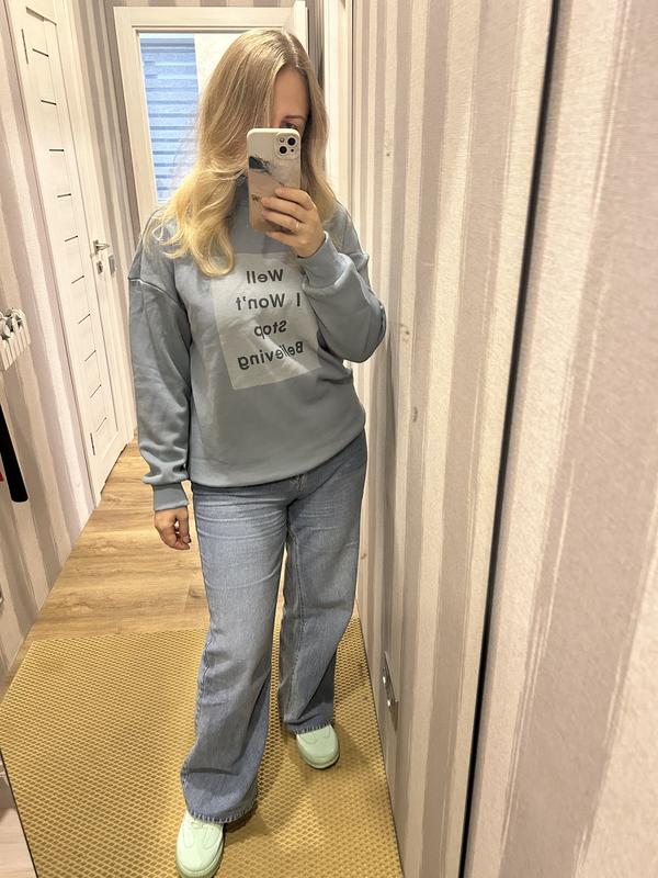 Класний світшот з надписом на флісі. Розмір вказано XL, пів обхват грудей - 55 см. Колір темно-голубий, ближче до світлого деніму.
