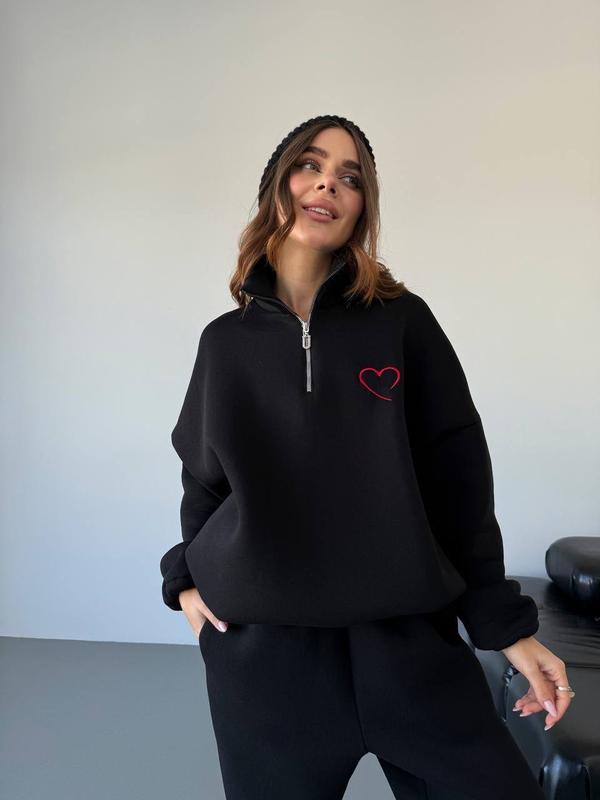 Модель : 099 Світшот з вишивкою з теплої трьохники Теплих речей багато не буває 🤭 Штани також можна придбати окремо Тканина : турецька трьохнитка Піньє Колір : чорний , графіт , молоко Розмір : S - L 🏷️ Ціна штанів : 999 грн