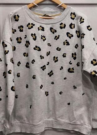 Кофта сіра з принтом гепардових плям Принт наявний спереду і на рукавах, спина без принту Б/у в хорошому стані Дефект (останнє фото) - обліз пушок на деяких плямах