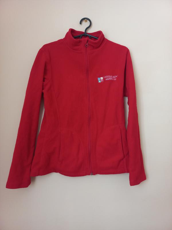 Тепла фліска яскраво червоного кольору, з замочком, 2 кишені. Вказаний розмір с, буде і л. Більш орієнтуйтесь на заміри. Заміри: Плечі - 40 см Під руками - 53 см Довжина - 61 см Рукав - 62 см