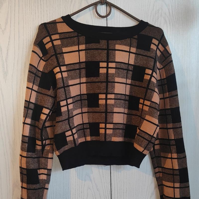 дуже стильна укорочена тепла кофта з принтом. дуже гарно підійде під високі штани чи юбку розмір м,але підійде на л-хл