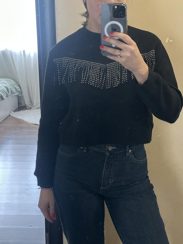 Чорний вкорочений світшот з бахромою та металічними закльопками. Розмір XS. Матеріал - 65% котон, 35% -поліестр. Тонкий фліс.