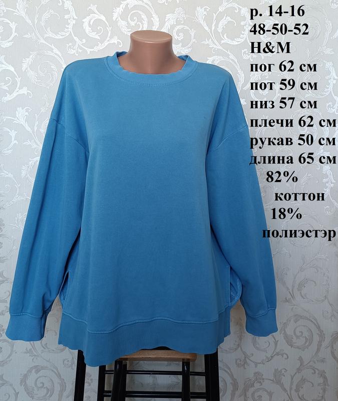р 14-16/48-50-52 блакитна кофта светр світшот толстовка бавовна трикотаж вільна оверсайз H&M * Заміри на фото вказані в рівному вигляді. * Склад на фото. * Стан дуже гарний. * Пара відтінкових цяток, показана на фото. В ціні враховано. * На бирці вказаний розмір, підійде на 14-16 розмір. Дивіться заміри. Цена 129 грн. Пересилаю Укріплу або Новою поштою на повну передоплату на картку Приватбанка.