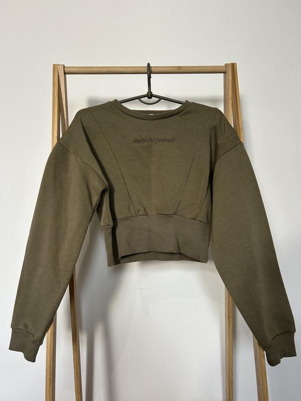 Укорочений світшот хакі на байці Довжина-46 см Пів обхват грудей-50 см Рукав від горлишка- 72 см