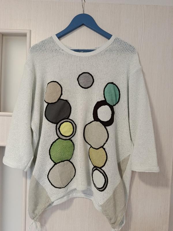 Ексклюзивний світшот з аплікацією, розмір XXL, 70% льону, 30%віскоза, нажаль бренд не визначено. Колір між білим і блакитним, кола зроблені з різних фактурних тканей (трикотаж, льон, полотняна тканина різного кольору), асиметричний крій, по боках довше, зроблені зав'язки. В ньому бачу потенціал. Довжина виробу по боках 75, плечі спущені 56, довжина рукава 40, пог 68 пот 64, фасон оверсайз.