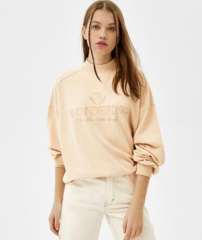 Оверсайз свитшот испанского бренда Bershka с вышивкой. Мягкий, приятный к телу. Состав: хлопок - 56%, полиэстр - 44%. Оверсайз Размер S ПОГ 60-68 рукав от горловины 80 внутренний шов рукава 52 длина 64