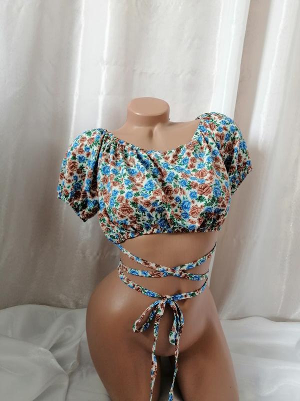 Топ с открытыми плечами пышными рукавчики завязка вокруг талией цветочный принт