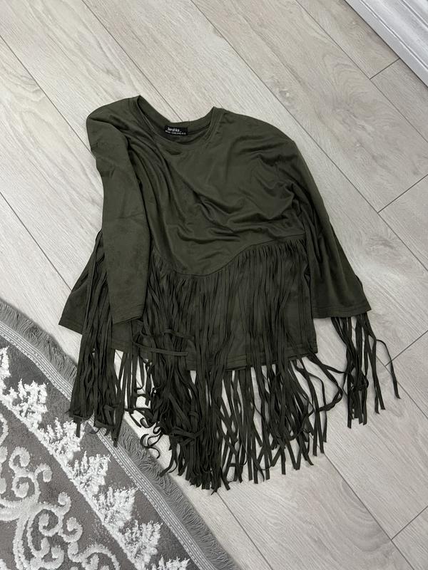 Шукаєте річ з характером? Ця кофта Bershka з мʼякої еко-замші — саме те, що потрібно! • Особливість: Неймовірно ефектна довга бахрома на грудях і рукавах. Це ідеальна основа для створення образу у стилі вестерн чи бохо-фестиваль. • Колір: Глибокий, насичений хакі (темний оливковий), який легко поєднується з денімом, чорним та бежевим. • Стан: Як нова