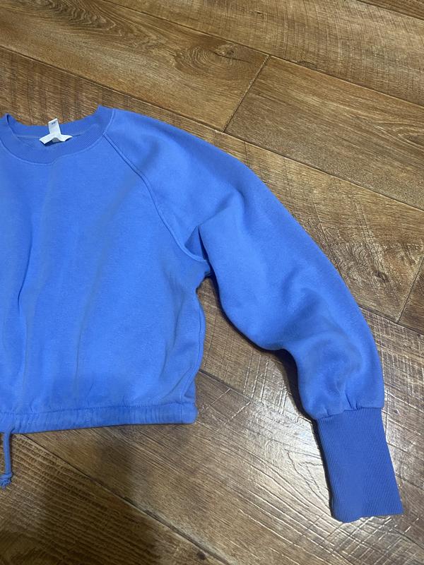 Світшот блакитного кольору H&M. Розмір S-M. На фото вказала на недолік, слід незрозумілого походження. В житті він ледь помітний, я побачила недолік на фото. Трішки вкорочений, знизу стягується. На флісі.